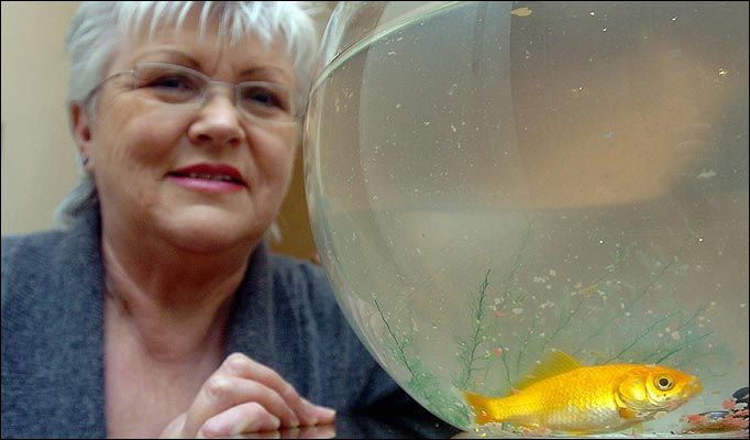 Barbara en haar goudvis Ginger in gelukkiger tijdenDe Engelse kwaliteitskrant The Sun meldde gisteren: “Owner Barbara Woodward found him lying on the floor behind a chest at her home at 7am. She assumed he was dead and, as she could not move the heavy chest, left the pet and went to work“. (einde citaat).