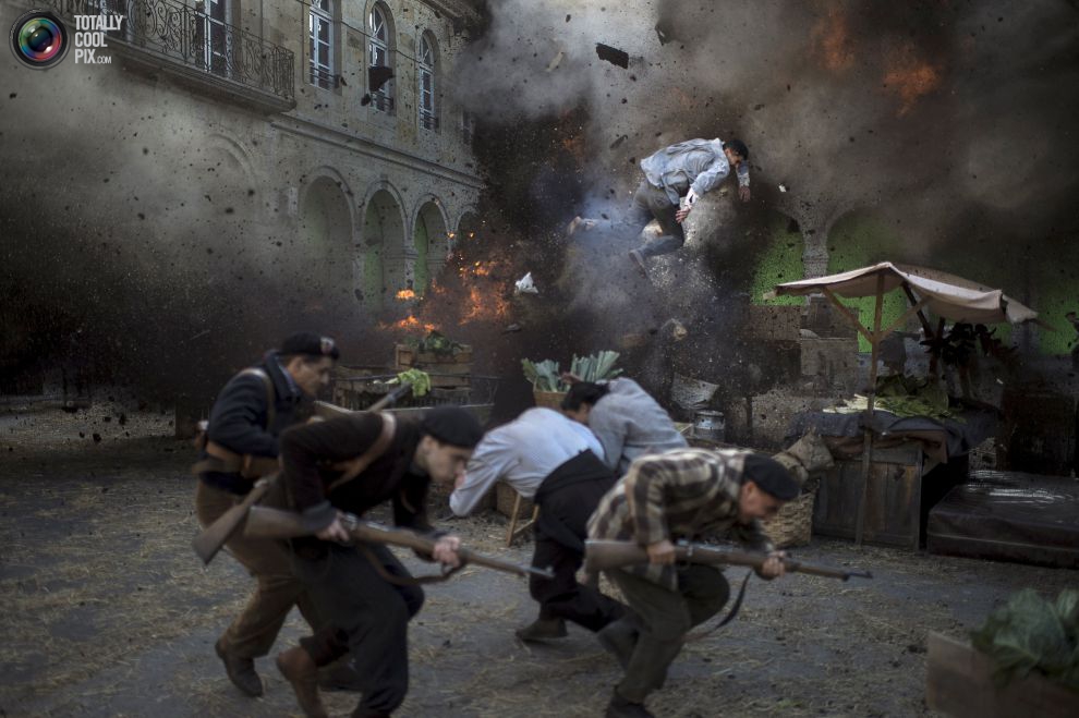 Wat de persfoto van het gewelddadige nieuwsjaar 2015 wordt? De bovenstaande gelukkig niet, want die werd gemaakt in het Spaanse Guernica, op de set van een nog niet verschenen film over de strijd in Baskenland. De stuntman in het hart van de foto zat 10 minuten later aan de tapas.