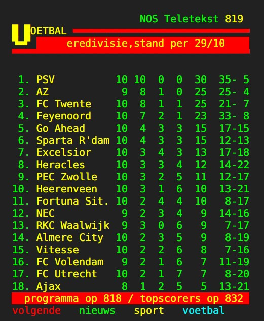 Ajax ondertussen is de ‘rode lantaarn-drager’ in groep B van de allerlaagste UEFA Europa League. Ajax staat bovendien sinds zondag op de allerlaatste plaats in de Eredivisie (een unicum! zie hieronder).