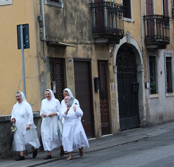 Het is zondag en dus is het op wat klokgelui na stil in het gelovige Vicenza. Zusters spoeden zich goedgeluimd in hun traditionele werkkleding naar de hoogmis. (zie foto)