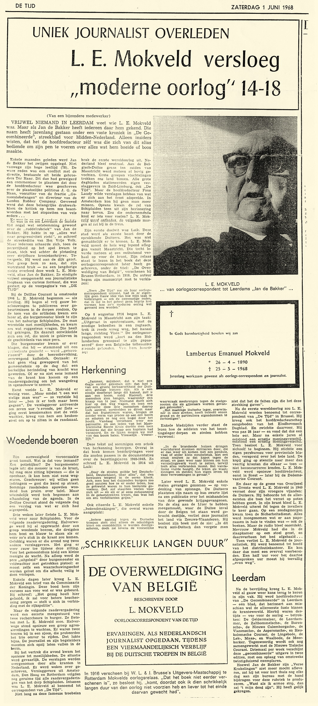 Het is alweer wat jaren geleden dat de heer G. Lasschuit uit de Geraniumstraat in Den Haag, een trouwe luisteraar van Radio West, mij wees op het bestaan van een beroemde journalistieke voorganger in de familie. Ik kreeg zelfs een boek van hem kado dat L.E. Mokveld in 1916 schreef over de maanden die hij tijdens de Eerste Wereldoorlog in België doorbracht. Mokveld was oorlogscorrespondent van 'De Tijd' in die dagen.