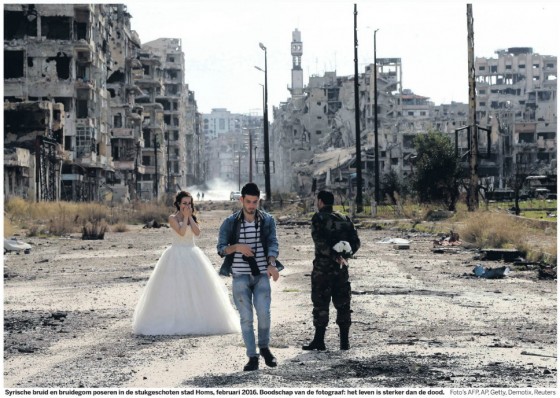 Een bruiloft als theater. De oorlog het decor. In deze Volkskrant serie is de boodschap duidelijk: Liefe overwint álles. Zelfs bombardementen. Ik ga even mee in dat sentiment.