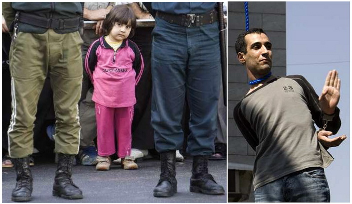 Een Iraans meisje kijkt toe bij de ophanging van Majid Kavousifar en Hossein Kavousifar. Deze mannen hebben een rechter vermoord die politieke dissidenten had vastgezet.