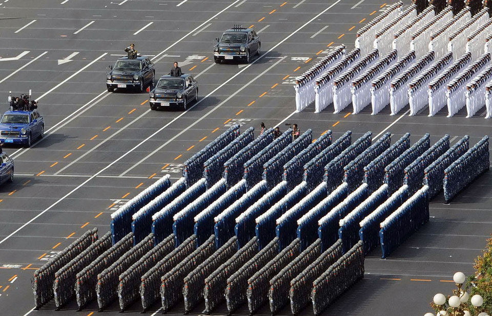 Da’s geen wonder, want op de nieuwe sexy uniformen van vrouwelijke marine- en politie-eenheden na was het militaire deel een standaarduitvoering van de jaarlijkse 1 oktober-parade.