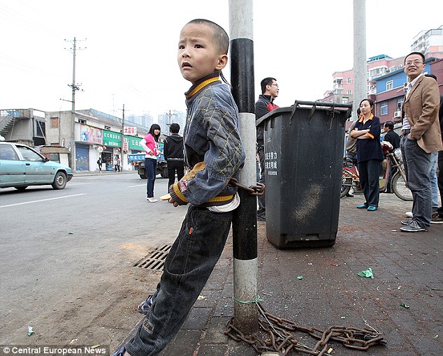 Het is een bizarre foto die het Britse Mail Online vandaag publiceerde. Dit is óók China: Ouders die hun kinderen aan palen ketenen om ze vervolgens te proberen te verkopen.