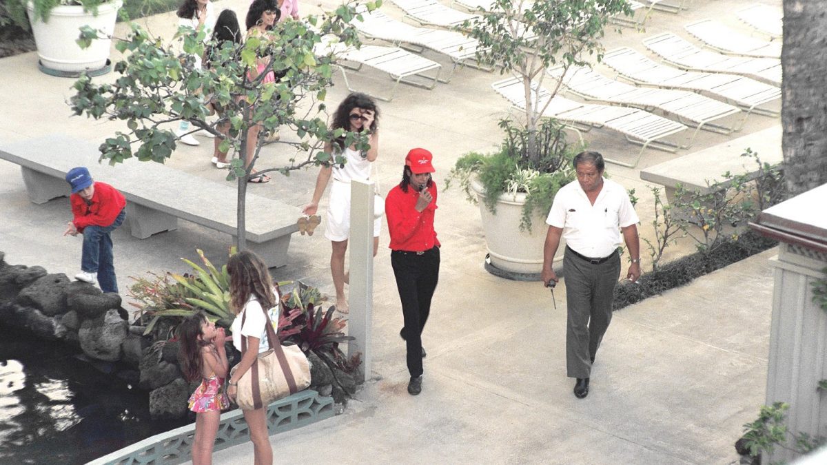 I considered removing these photographs of Jackson from the internet but decided to keep them available as a document of time he spent with one of his victims. The small boy dressed in a red shirt to match Michael is James (“Jimmy”) Safechuck, a boy who appeared in a Pepsi commercial with Michael and was traveling with him. When I saw them they were inseparable around the hotel together, chasing each other, playing tag, making soap bubbles on a balcony of the hotel, walking closely on the beach together and looking at the hotel’s dolphins, turtles and penguins together. Michael, though 29 1/2 years old at the time, acted more like someone Jimmy′s age. Jimmy is about 10 years old at this time. The woman in white walking behind Michael is Jimmy′s mother.