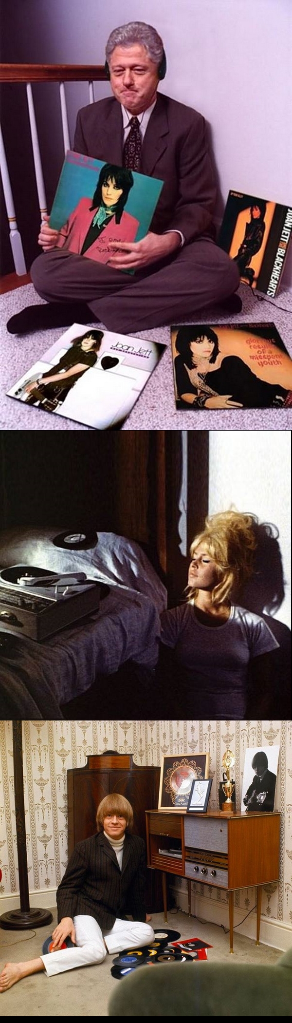 Daaronder een foto van Frans actrice van weleer Brigitte Bardot die wegzwijmelt bij de pick-up met 45-toeren plaatjes op haar bed.